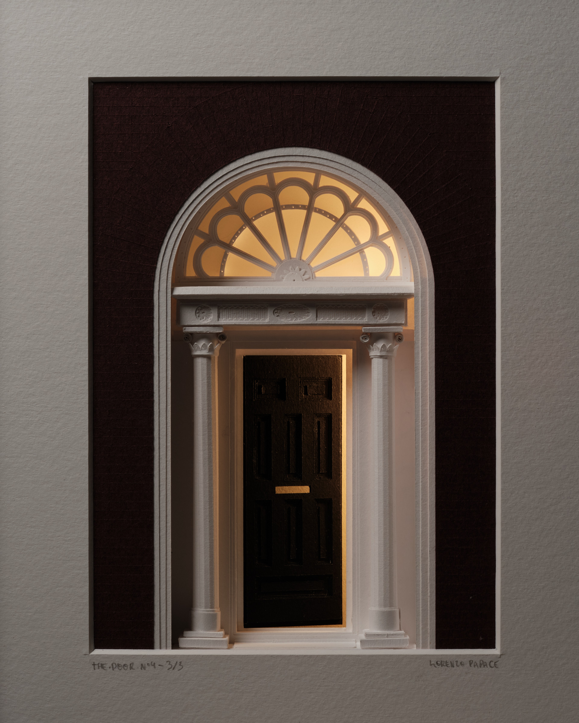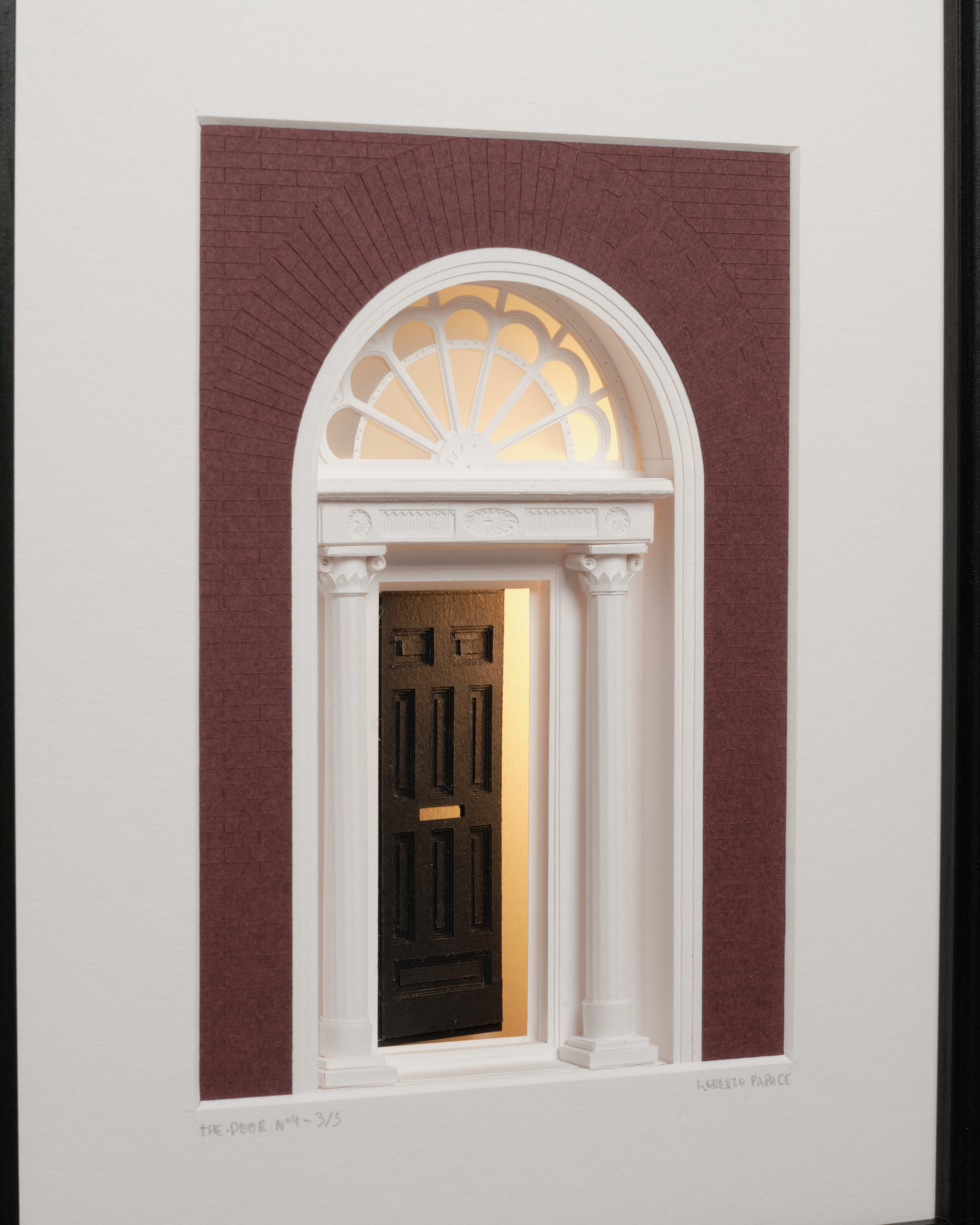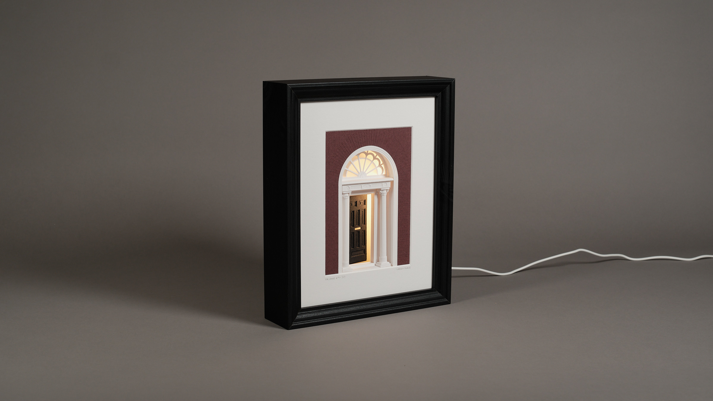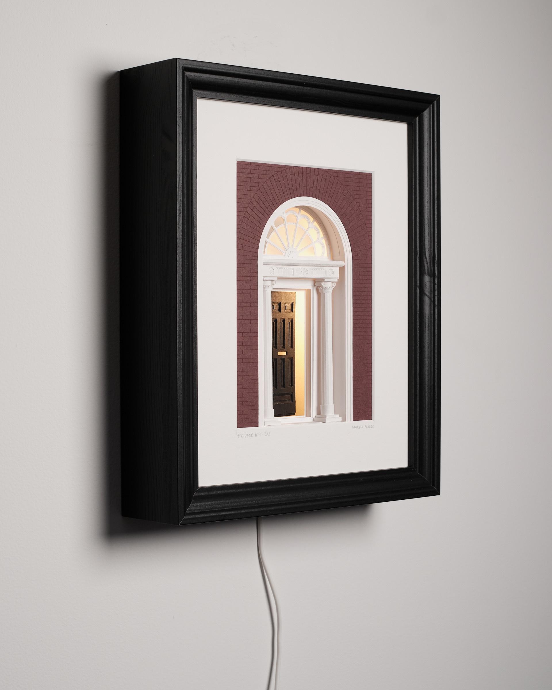 Les rues géorgiennes de Dublin sont faites de façades régulières, de répétitions. Parfois, un détail attire le regard, comme la couleur d'une porte. The Door n°4 capture ce moment de surprise : une porte entrouverte, et une lueur venant de l’intérieur. Papier découpé à la main, assemblée en profondeur. Le cadre devient une petite scène architecturale. Accrochée ou posée, l’œuvre change subtilement selon qu’elle est allumée ou éteinte.![]()