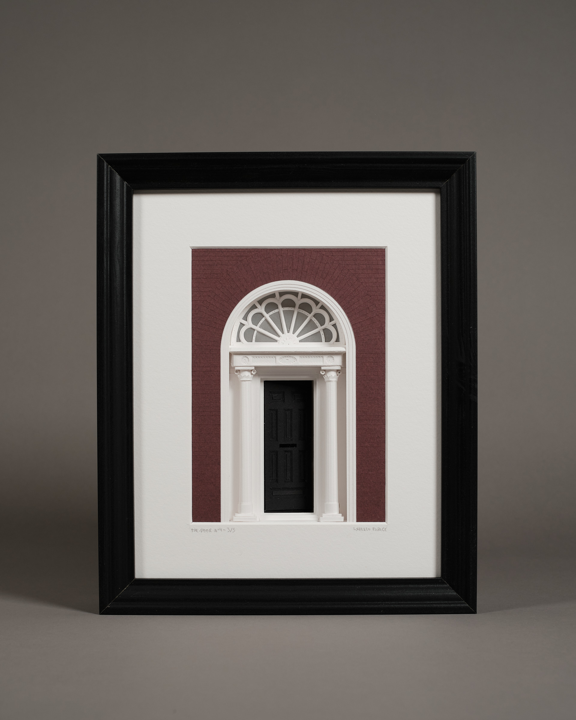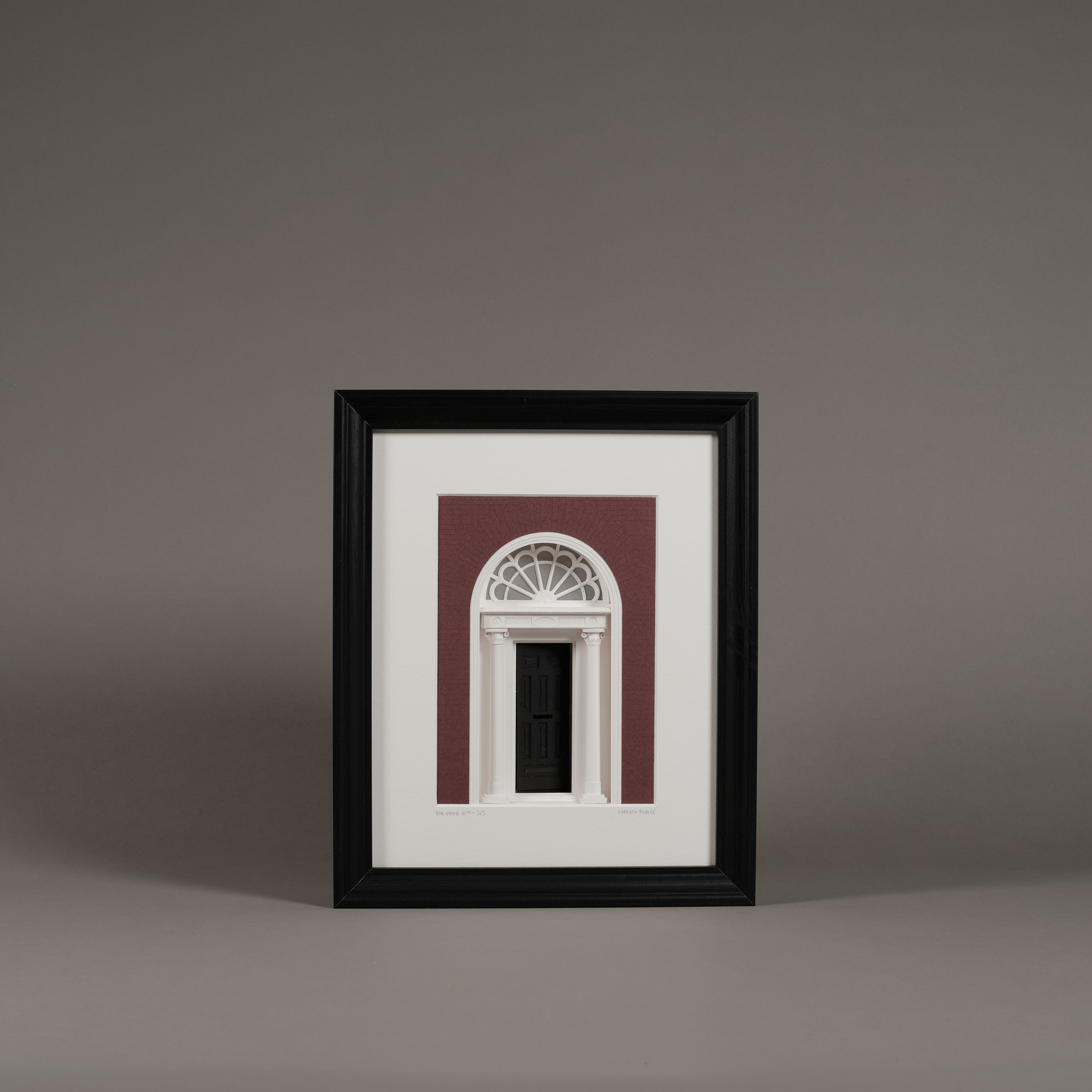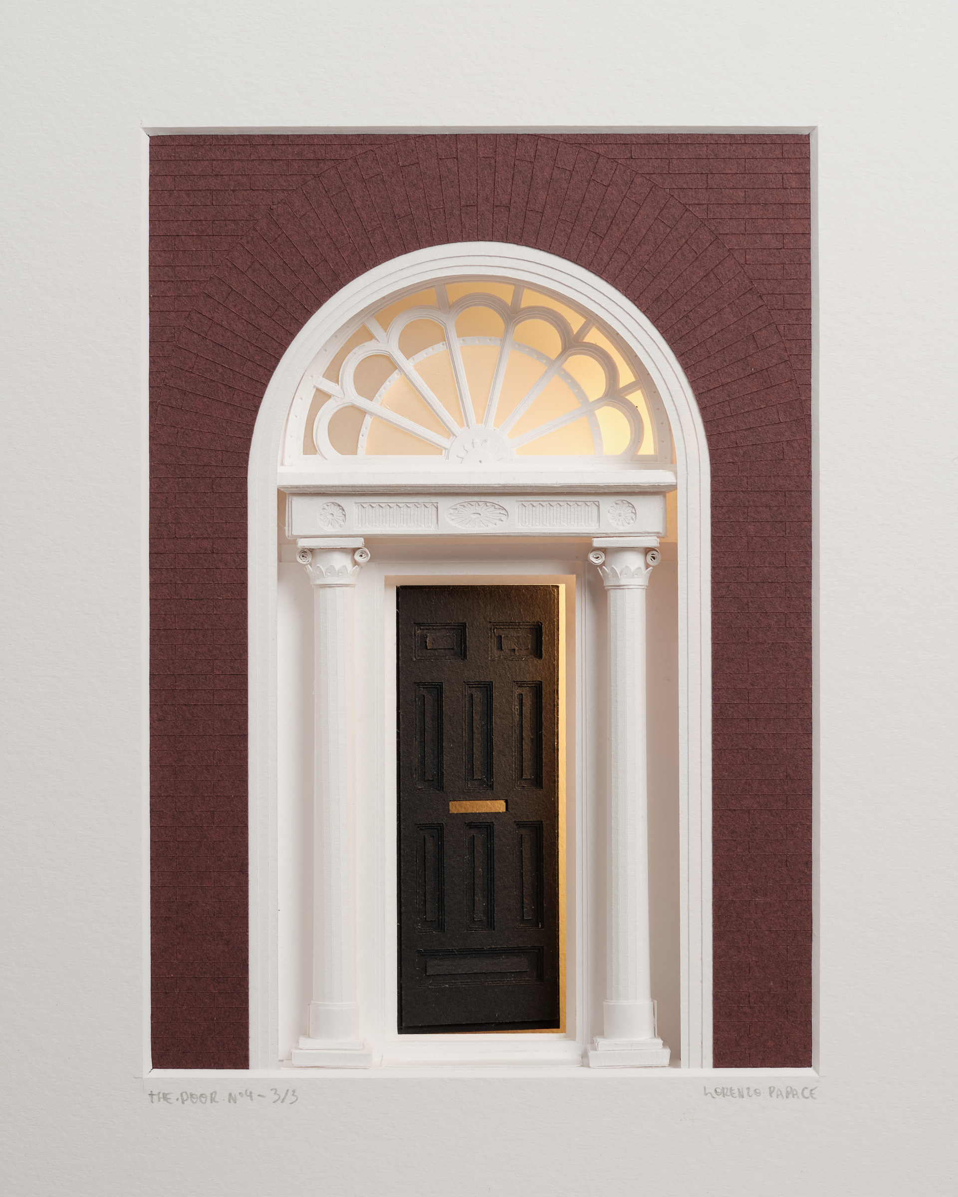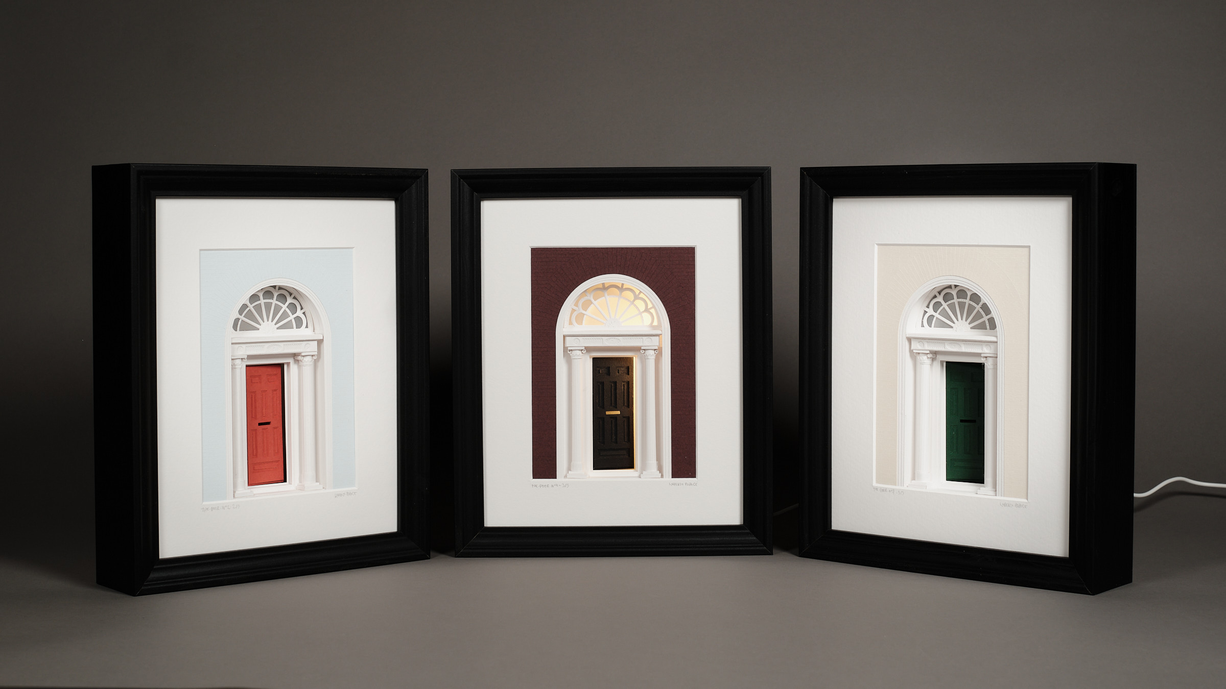 Les rues géorgiennes de Dublin sont faites de façades régulières, de répétitions. Parfois, un détail attire le regard, comme la couleur d'une porte. The Door n°4 capture ce moment de surprise : une porte entrouverte, et une lueur venant de l’intérieur. Papier découpé à la main, assemblée en profondeur. Le cadre devient une petite scène architecturale. Accrochée ou posée, l’œuvre change subtilement selon qu’elle est allumée ou éteinte.![]()